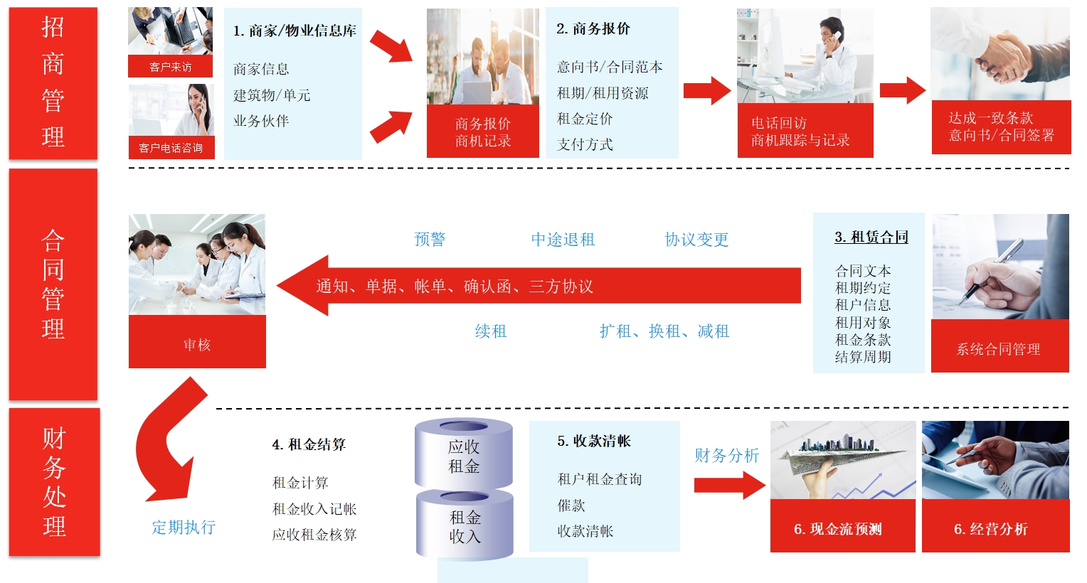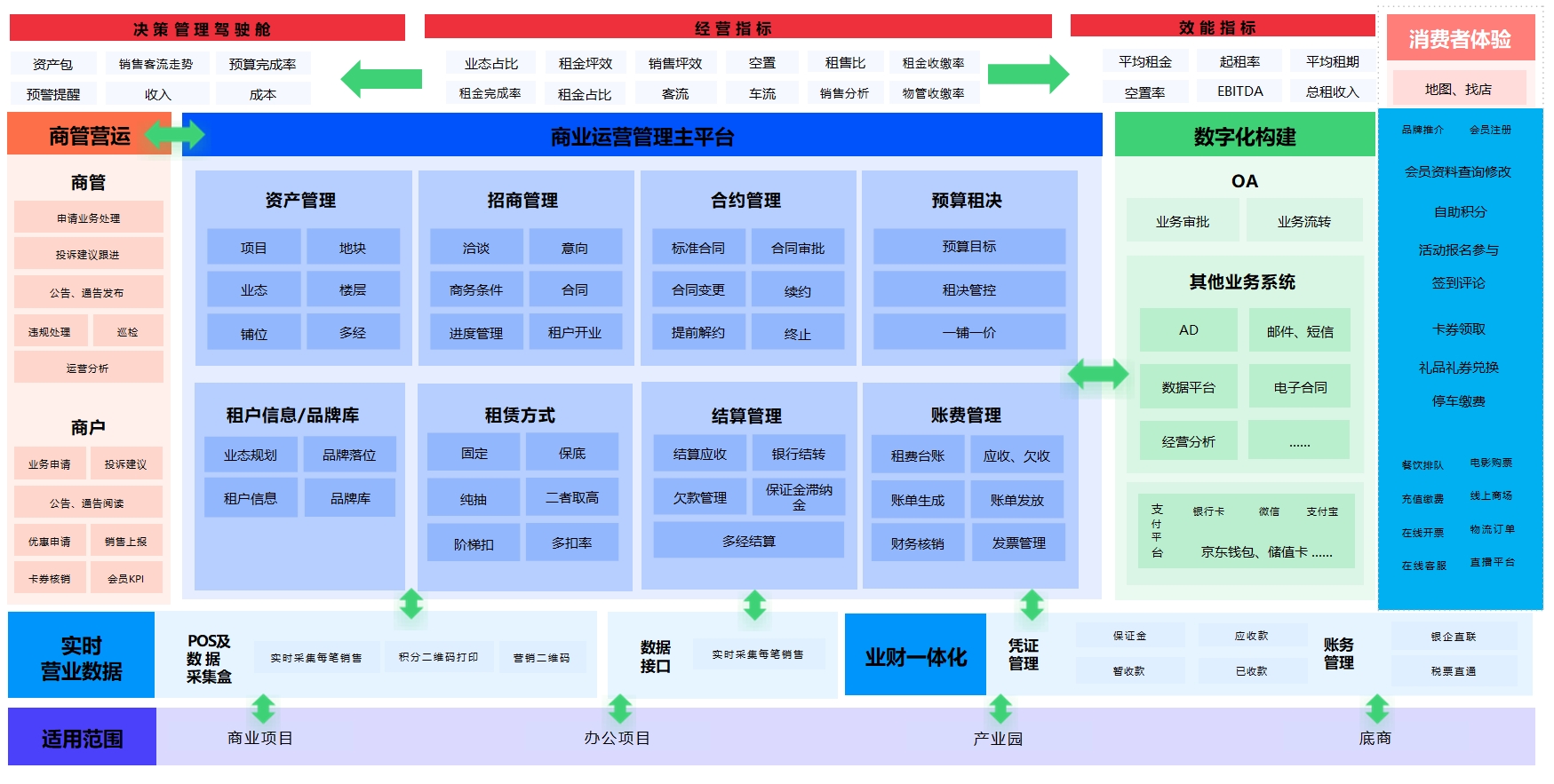 天润资产运营管理平台,涵盖招商、营运、会员、物业、财务、停车场数据接口等各种模块。专注于赋能商业地产数字化转型,通过顾客营销、租户运营、内部管控、项目拓展等多维度的管理,为商业管理的“人”、“店”、“场”引入数字化的落地方案,增强顾客满意度,提升商场经营效率。